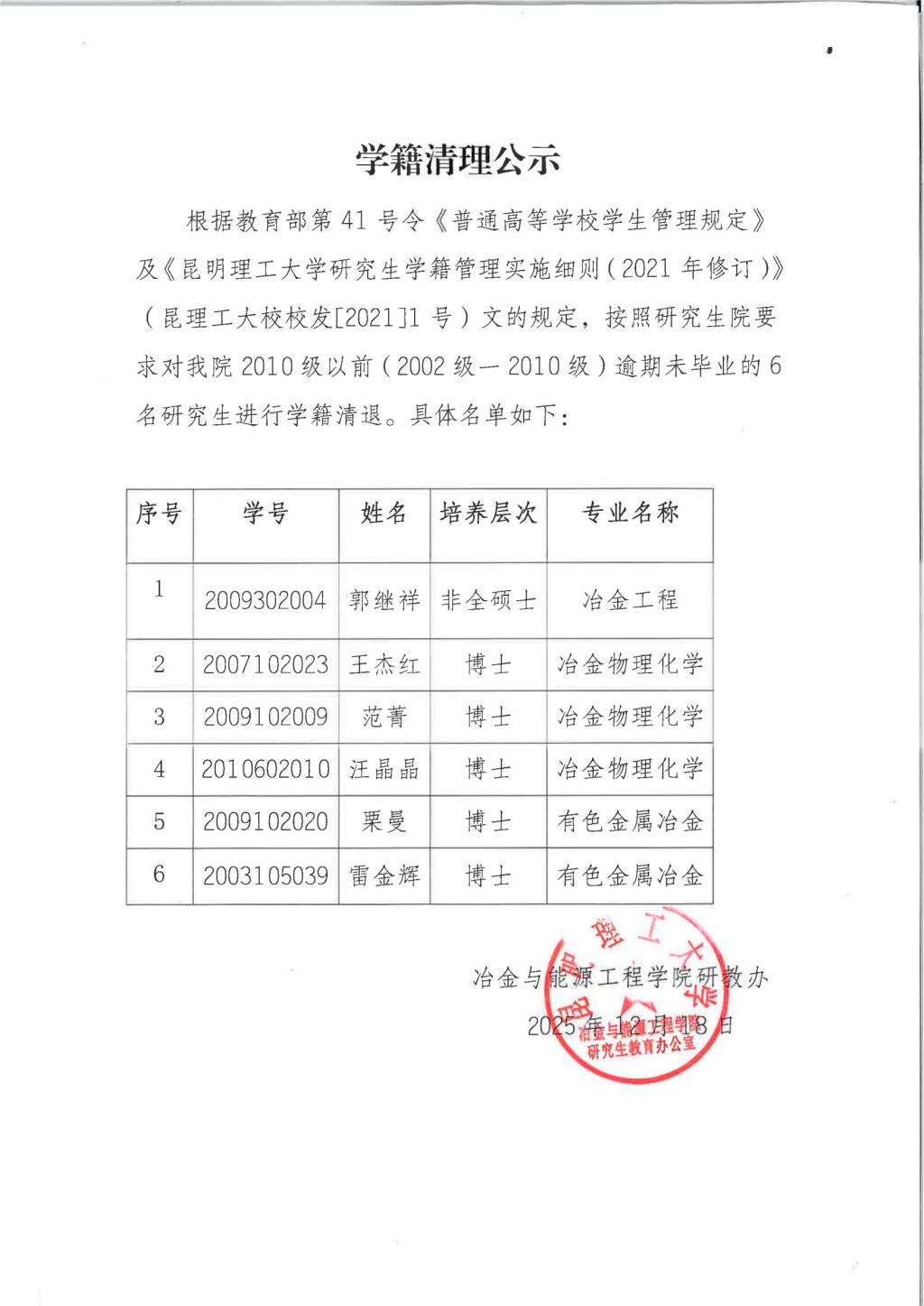 2025年12月冶金与能源工程学院研究生学籍清理公示