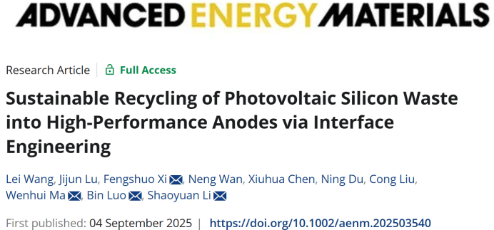 近日,昆明理工大学硅冶金与硅材料创新团队与澳大利亚昆士兰大学罗彬教授合作在国际知名期刊Advanced Energy Materials上发表题为“Sustainable Recycling of Photovoltaic Silicon Waste into High-Performance Anodes via Interface Engineering”的最新研究成果。