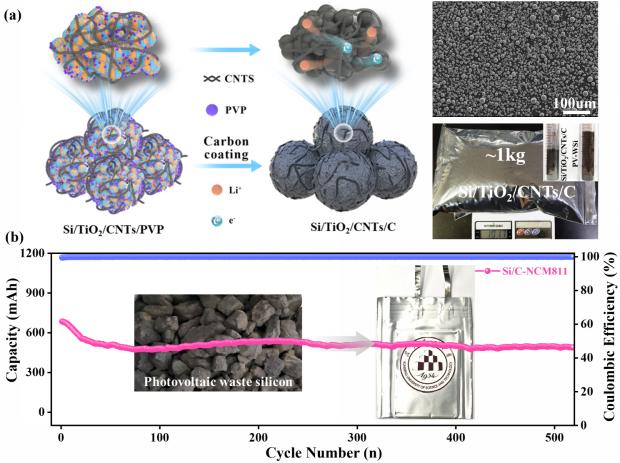 蓬勃发展的光伏产业带来大量的硅切割废料,不当处置不仅可能带来巨大的资源浪费,还会增加严重的环境负担。针对硅切割废料的高效增值回用难题,昆明理工大学硅冶金与硅材料团队提出借助光伏硅切割废料独特二维结构特征,制备高性能硅基负极材料。通过砂磨构建起硅与二氧化钛(TiO2)的强界面耦合,借助刚性相界面粘附与载荷分担协同缓解体积变化,实现了高性能硅基复合材料的制备,所得Si/TiO2/CNTs/C复合材料振实密度达到 0.9 g·cm-3,组装的软包全电池能量密度达到 320 Wh·kg-1,并保持了优异的循环性能和倍率性能。研究团队在实验室实现了公斤级高性能硅基复合材料的制备,为光伏硅切割废料高值回用制备高性能硅基负极的可行性提供了新路径。