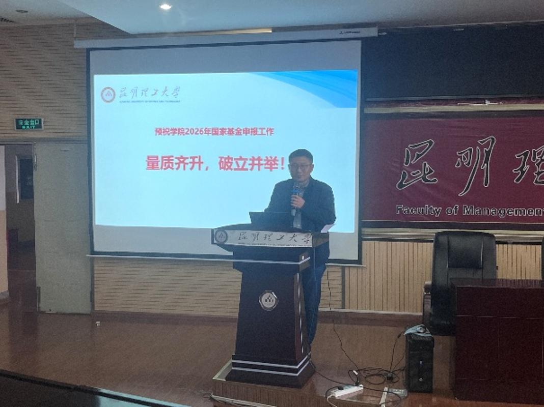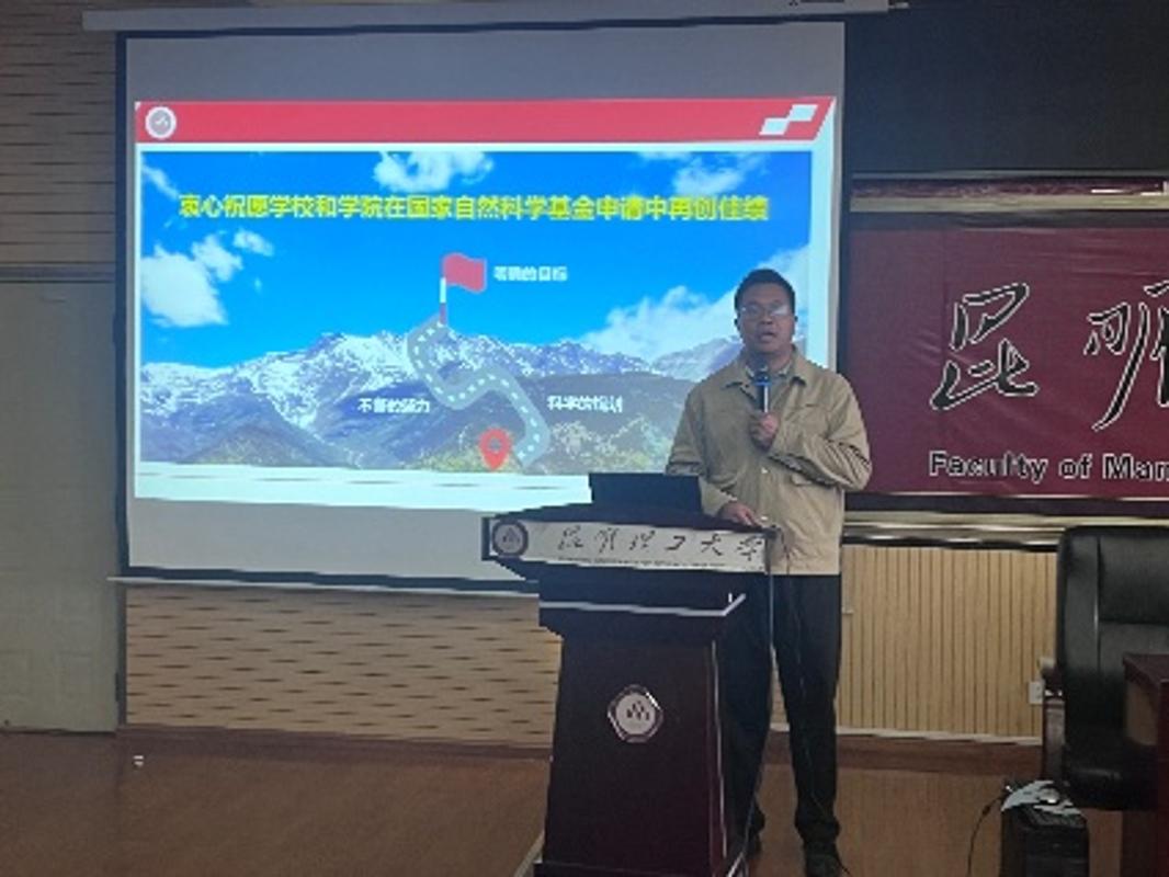 郭胜惠院长进行了动员讲话,他指出,国家自然科学基金是提升学科建设、强化品牌能力的关键指标,也是学院师生发展的重要科研资源。2026年学院将实施"三个强化",强化组织保障,强化过程管理,强化资源整合,进一步完善促进基金申报的相关措施,以团队为抓手,全面提升基金申报的数量和质量。