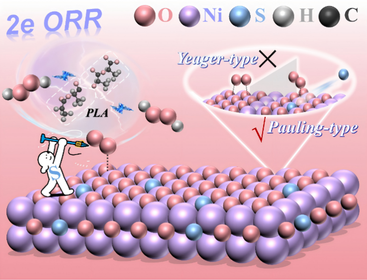 进展二以“Anion-Driven Oxygen Configuration Tuning on NiO Boosts Hydrogen Peroxide Production”为题在《Applied Catalysis B: Environment and Energy》上发表。针对现有催化剂瓶颈,创新采用硫(S)、磷(P)、硒(Se)等非金属阴离子对NiO掺杂改性,精准调控其电子结构与晶格特性,显著提升催化性能。阴离子成功取代NiO晶格部分氧原子,形成稳定Ni−X键,优化了镍活性位点电子密度,促使氧吸附构型从不利于2e− ORR的Yeager构型转变为有利的Pauling构型。其中硫掺杂NiO(S-NiO)表现最优,H2O2选择性超95%。基于该催化剂高效原位生成H2O2的特性,进一步将其拓展至污染物治理,12小时内实现聚乳酸微塑料27.22%的降解率,为微塑料污染治理提供新思路。该研究为高效电催化剂设计提供了新范式,为绿色低碳发展与生态环境保护提供重要技术支撑。