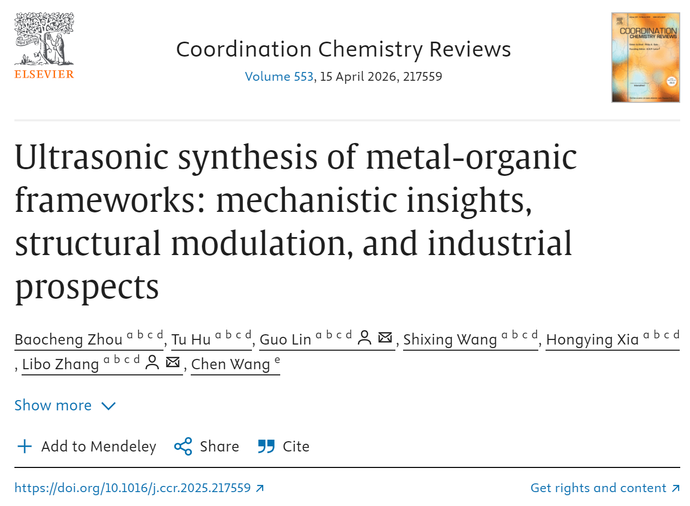 在此背景下,昆明理工大学非常规冶金团队近期在化学领域权威期刊《Coordination Chemistry Reviews》上发表了题为“Ultrasonic synthesis of metal-organic frameworks: mechanistic insights, structural modulation, and industrial prospects”的综述论文。该论文系统总结了超声波合成MOFs的研究进展,从机理阐释、结构调控、性能优势及产业化前景等多个维度,对该领域进行了全面梳理与展望。